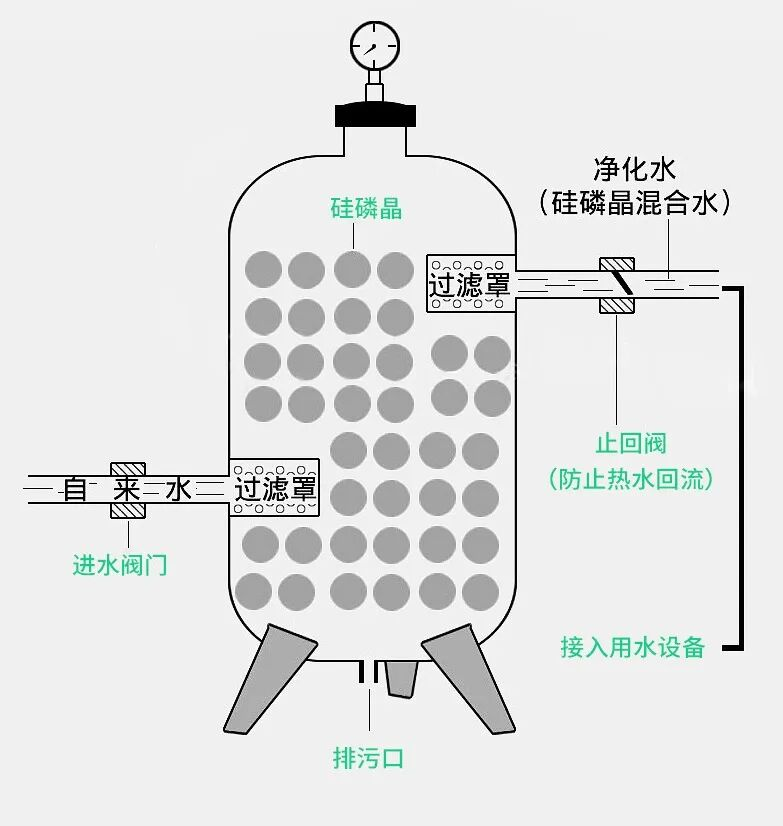 尤其值得一提的是,针对不同地域的水质特点,硅磷晶罐还能实现本地化优化。比如在水质硬度高、含氟量超标的区域,采用耐氟腐蚀的 316L 不锈钢材质;在温差大的地区,加装智能温控组件,确保冬夏两季处理效果稳定。无需复杂操作,不用专人值守,每 3-6 个月补加一次硅磷晶即可,运行成本低且维护便捷,真正做到 “一次安装,长久省心”。